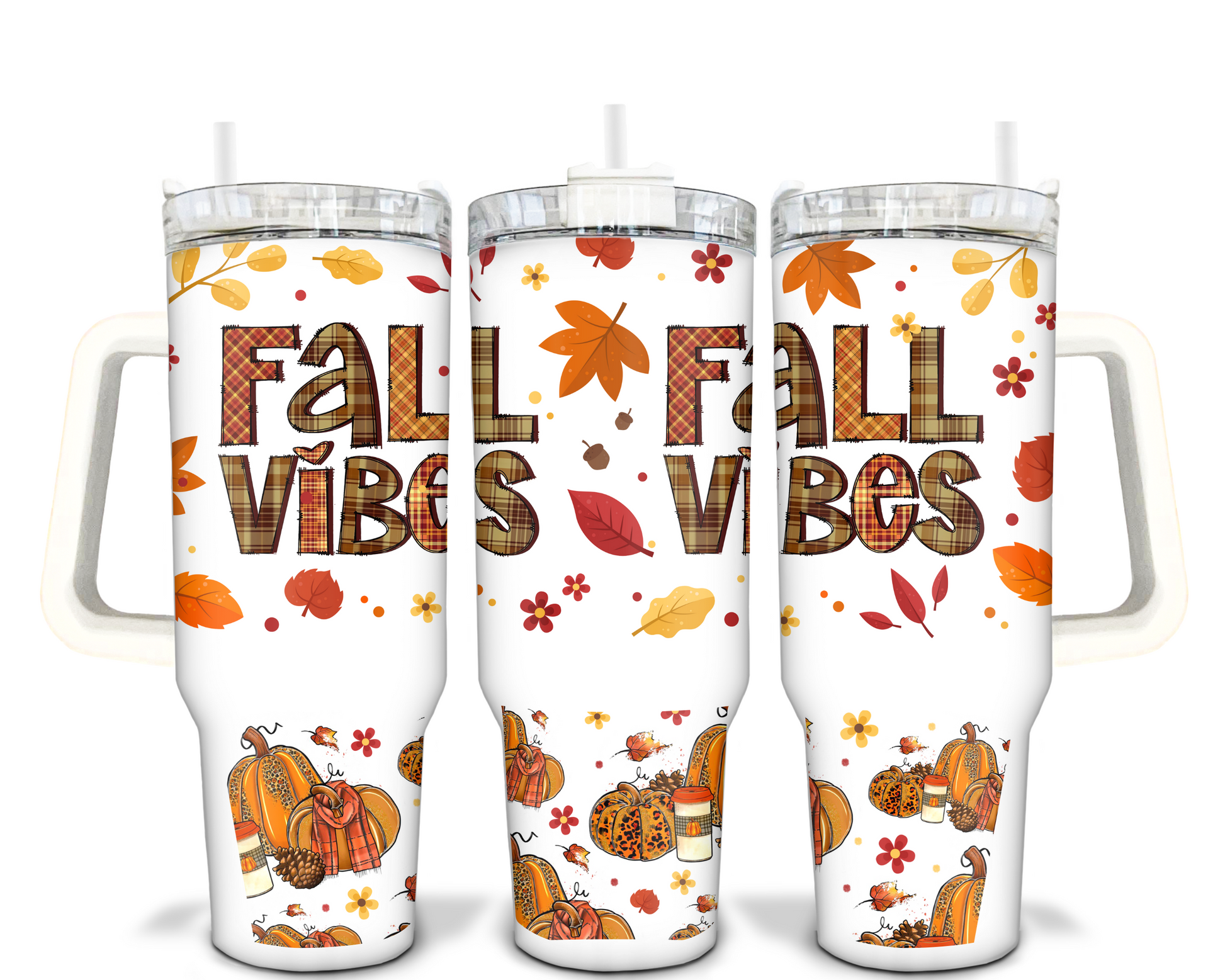 Fall Vibes Sublimated, double walled, 40oz Quencher Tumbler. These Stanley like Tumblers are great to keep your hot drinks hotter and your cold drinks colder...longer. They come with a lid with closure, a straw and a rubber bottom bumper. Available with White or Black Handle. Gifts for him / Gifts for her / Personalized Gifts