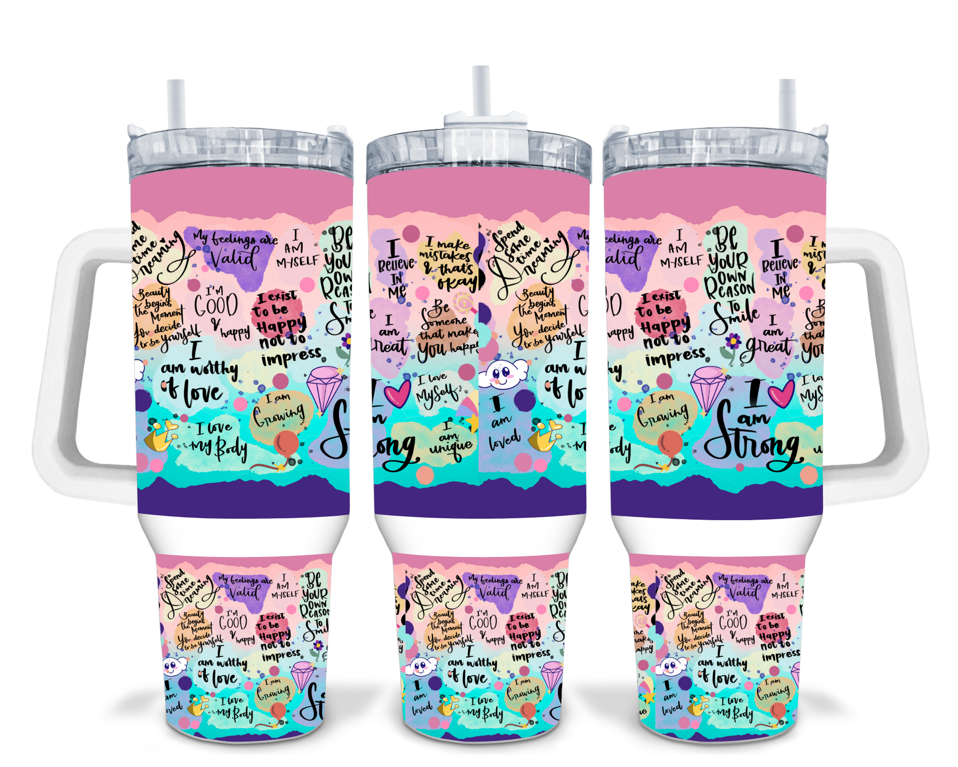 I am Strong Mental Health Sublimated, double walled, 40oz Quencher Tumbler. These Stanley like Tumblers are great to keep your hot drinks hotter and your cold drinks colder...longer. They come with a lid with closure, a straw and a rubber bottom bumper. Available with White or Black Handle. Gifts for him / Gifts for her / Personalized Gifts
