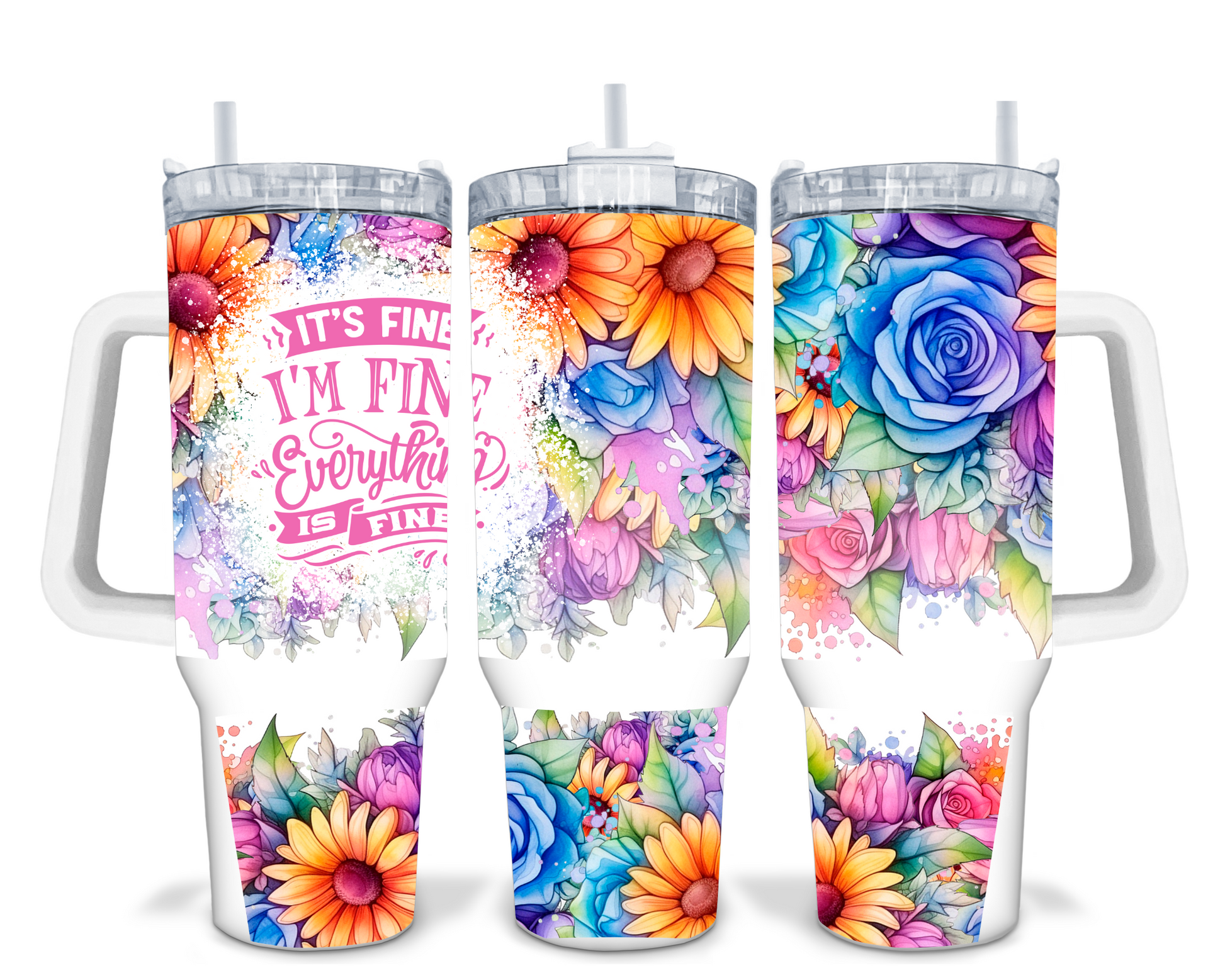 It's fine, I'm Fine Mental Health Sublimated, double walled, 40oz Quencher Tumbler. These Stanley like Tumblers are great to keep your hot drinks hotter and your cold drinks colder...longer. They come with a lid with closure, a straw and a rubber bottom bumper. Available with White or Black Handle. Gifts for him / Gifts for her / Personalized Gifts