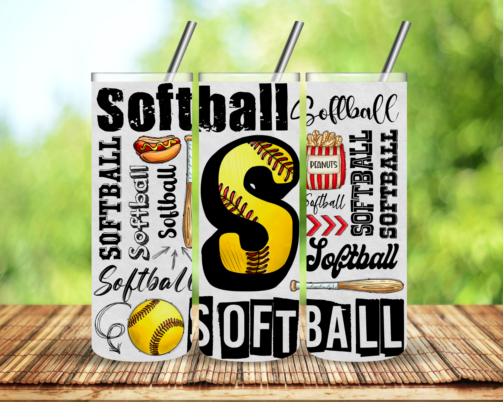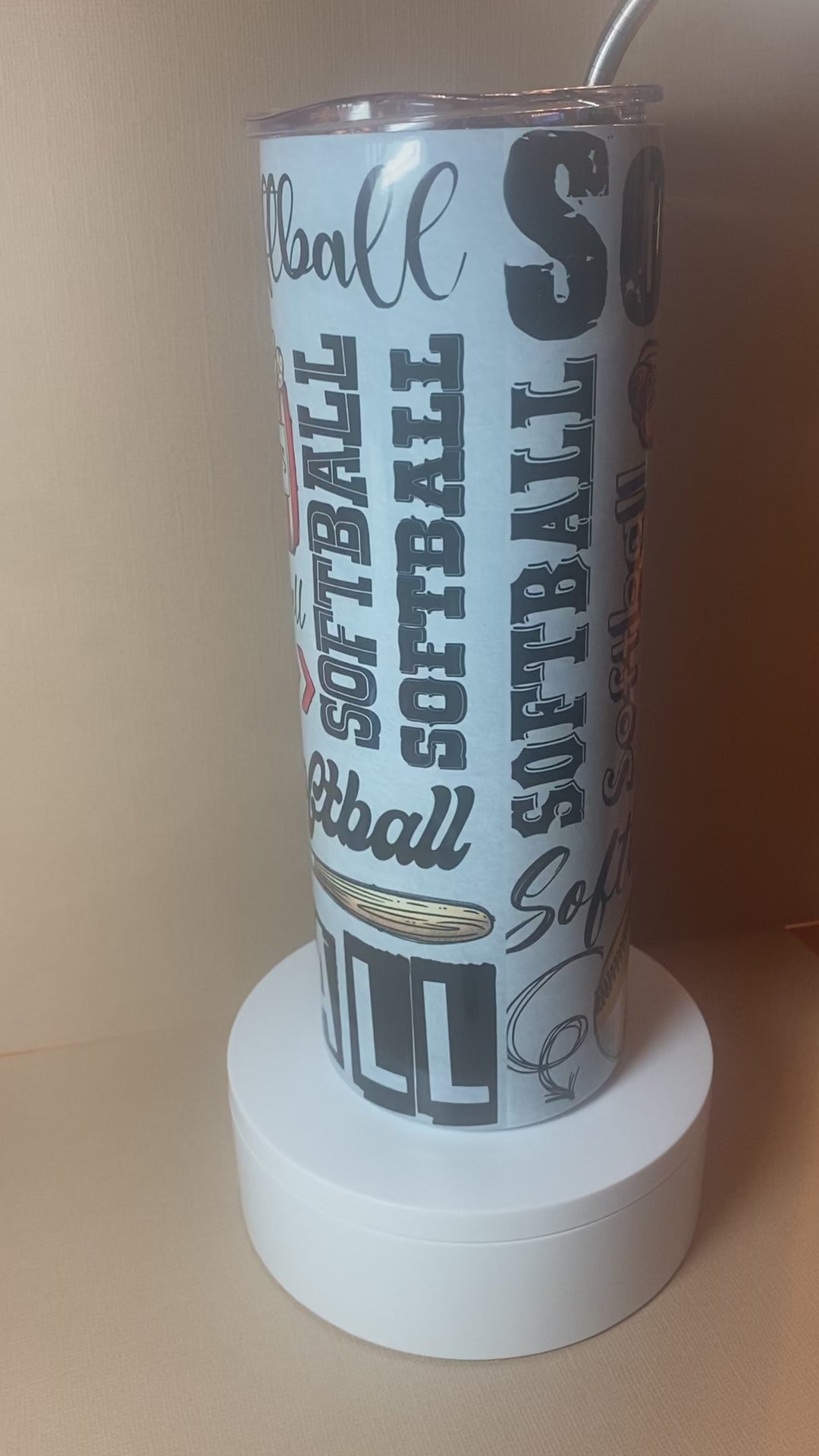 Softball Wordy sublimation 20 ounce tumbler. Great for keeping your drinks cold or hot...and have a little fun with it. Comes with lid, straw and bottom rubber bumper. Do not put in microwave or dishwasher.