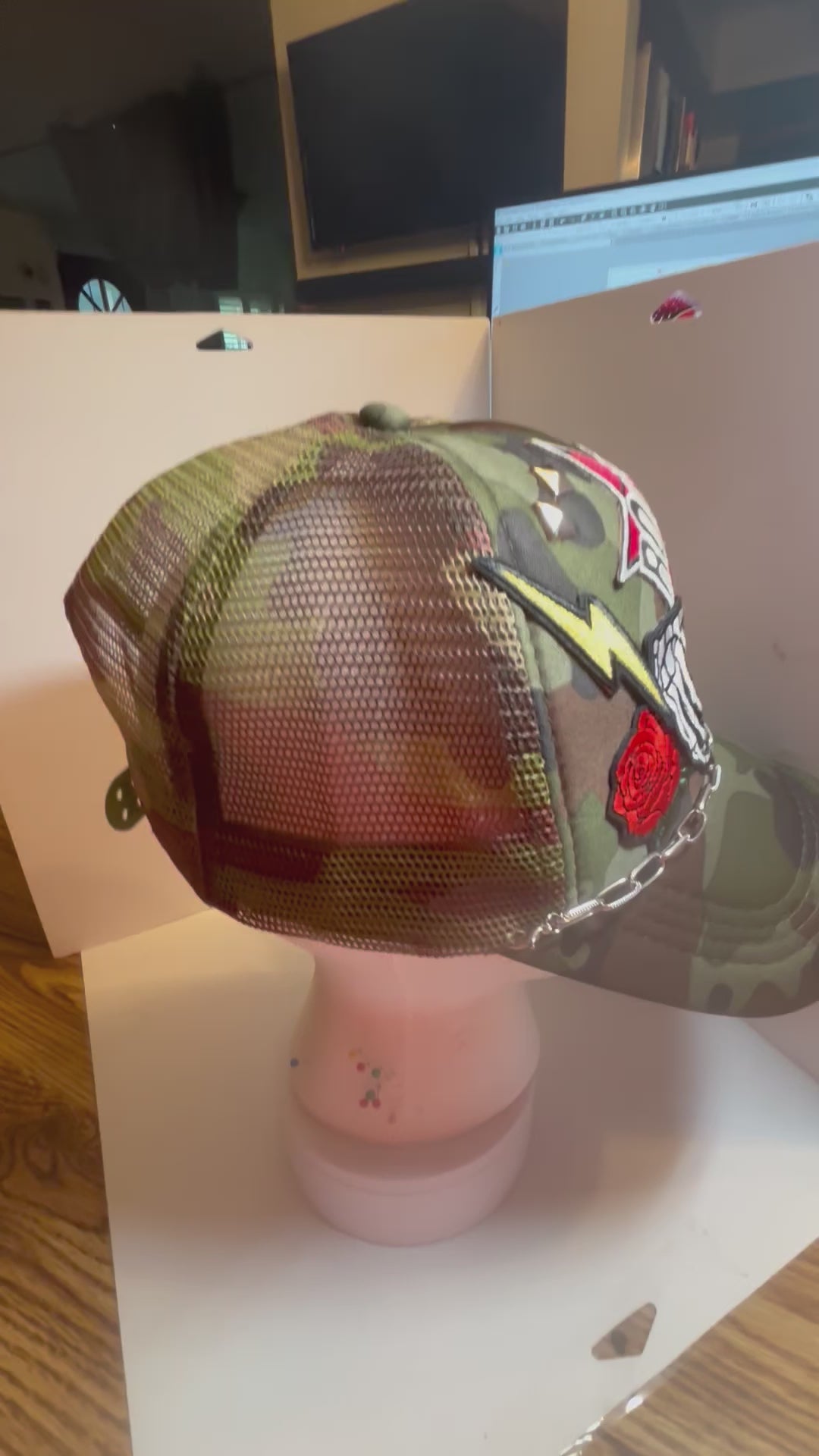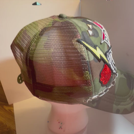 Rocker themed Trucker Patch Hat. These are the hottest trend on social media today. Great for festivals, concerts, night life and everyday wear. This foam trucker hat is fully adjustable and offered in hat colors Black, White, Light Pink, Neon Pink, Neon Yellow and Green Camouflage. Custom Hats avail. One size fits all. $35